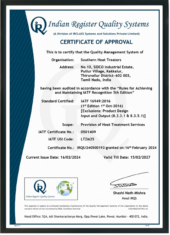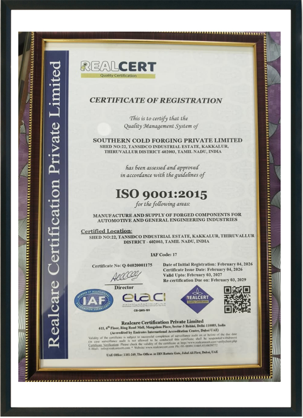 Southern Cold Forging Pvt. Ltd. is an ISO 9001:2015 certified company, demonstrating our adherence to internationally recognized quality management standards. This certification reflects our systematic approach to quality planning, risk management, documentation control, and performance evaluation across cold forging, machining, and heat treatment operations.