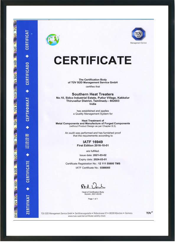 Southern Cold Forging Pvt. Ltd. is an ISO 9001:2015 certified company, demonstrating our adherence to internationally recognized quality management standards. This certification reflects our systematic approach to quality planning, risk management, documentation control, and performance evaluation across cold forging, machining, and heat treatment operations.